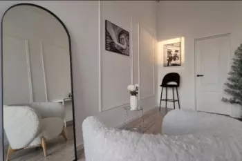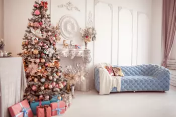 Классическая зона с белой лепниной, камином, красивым голубым диваном и заснеженной ёлкой!В нем также есть 5-ти метровая белая стена, которая является аналогом циклорамы. Можно снимать лукбуки. Забронировать...