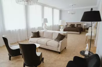 Зал-апартаменты, в котором полностью рабочая кухня с островом (индукционная плита, духовой шкаф, вода, холодильник, посудомоечная машина), стильная гостиная, спальня с большой кроватью. Дизайнерская мебель:...