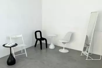 Светлый зал на 80 кв.м. с белыми стенами и бетонным полом — универсальная площадка для любых съемок. Огромная циклорама 5×6 м, стильная мебель в духе баухаус, розовый акцентный стул и детали...