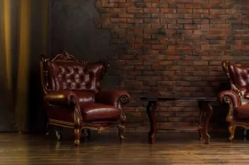 Интерьерный зал Magic площадью 60 кв.м. в Studio Kraft с полом из темного дерева по всей площади, с локацией с кирпичной стеной, винтажной мебелью, из красного дерева и кожи, фактурной стеной....