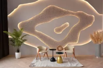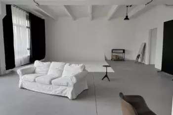 Большой светло-кремовый диван, мягкий свет и уютная атмосфера — всё создано для тёплых, трепетных кадров ☁️ Площадь зала — 40 м², две белые стены и акцентная стена из бежевых объёмных...