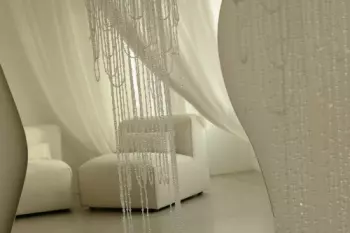 Зал Air это белая ткань в пространстве по всему помещению для создания монохромной белой эстетики, белые потолки и стены, белые тканевые перегородки...
