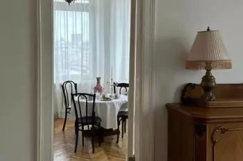 Зал из двух проходных комнат с обеденной зоной в стиле сталинского ампира. Винтажная мебель 30х годов, лепнина, высокие потолки и двери. Буфет с посудой, сервированный стол Реквизит: Лепнина, высокие...