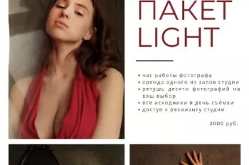 Light - пакет с оптимальным наполнением для тех, кто предпочитает подбирать и готовить образ самостоятельно:- час работы фотографа и аренда зала студии- все исходники в день съёмки- ретушь десяти фотографий на ваш выбор- свободный доступ ко всему реквизитуПолный...