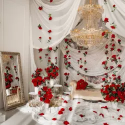 Имеется 2 зоны: циклорама и зона с новогодней локацией на красном фоне. В 2 раза больше возможностей для съемки.