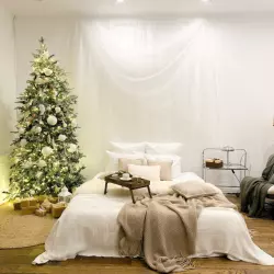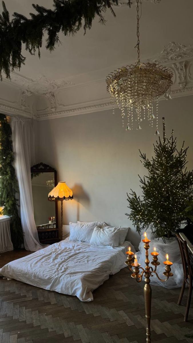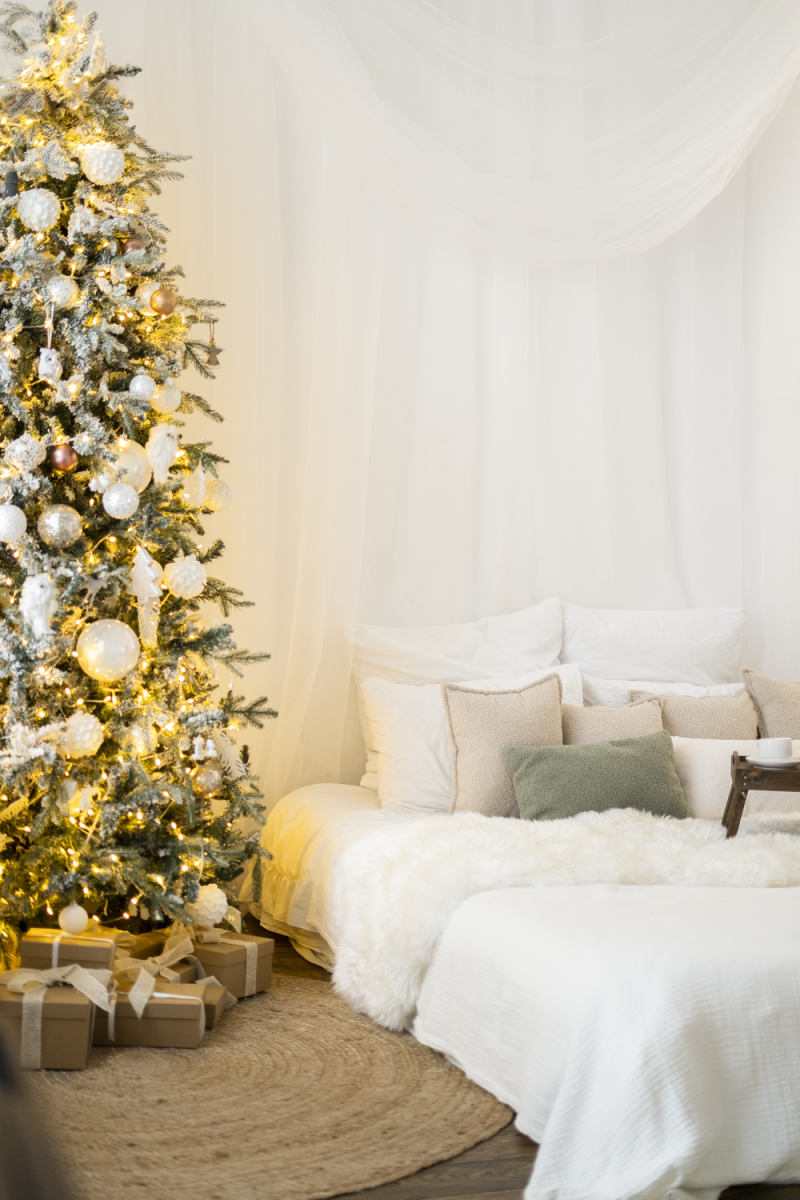 Зал представляет собой светлое пространство в спокойной цветовой гамме, оформленное для новогодних фотосессий.