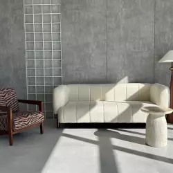 Светлое пространство с естественным светом, уютной аркой, стильным диваном и полом в "елочку".