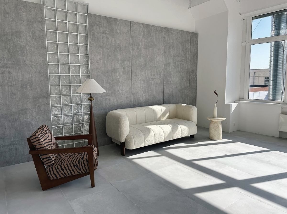 Просторный зал с циклорамой, стильной мебелью и с большим количеством естественного света.