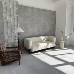 СКАНДИ — просторный минималистичный зал с двумя деревянными акцентными стенами и серой бетонной фактурой. Большие окна дают мягкий естественный свет, а лаконичная мебель с кожаными креслами дополняет сканди‑настроение.
