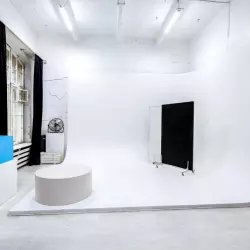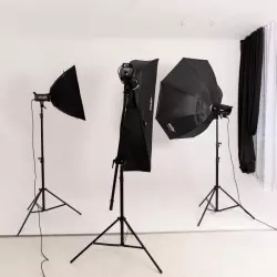 Две циклорамы чёрная и белая, точки подвеса над циклорамами, импульсный свет: пять источников Profoto D1 500 Air, постоянный свет: два источника Godox серии SL100 (по умолчанию стоят с софтбоксами), фоновая система, естественный свет, камерная гримёрка