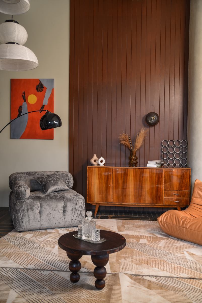 Большой интерьерный зал выполненный в стилистике интерьеров 1970х годов. Большая деревянная стена. Красивый эркер. Пол - плитка. Площадь - 80 кв.м. Потолки 3,2 м 5 окон выходят во внутренний двор Петроградского района