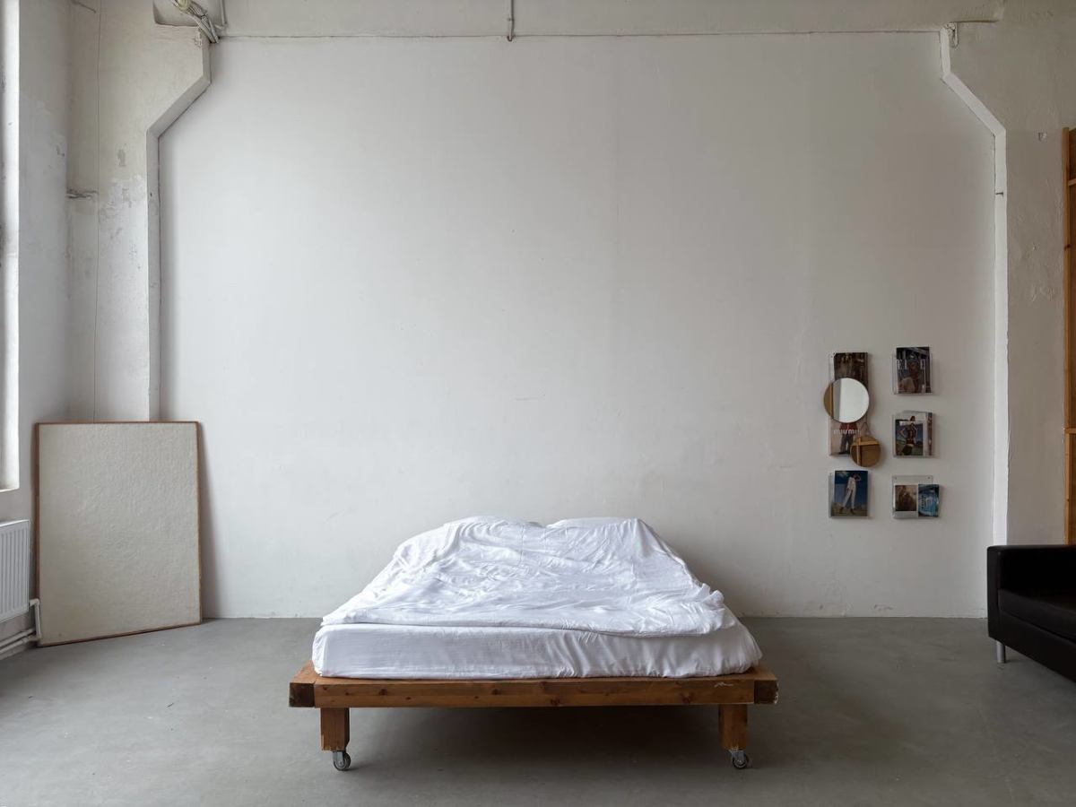 Минималистичный зал с кроватью, стульями, зеркалом и кожаным диваном. В зале установлена плетёная ширма, на окне шифоновая штора в пол. Текстурная стена напротив кровати с плотной светлой шторой, цветком в горшке и декоративными камнями. Подходит для контентной, семейной съемок и съемки одежды и нижнего белья.