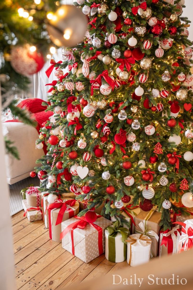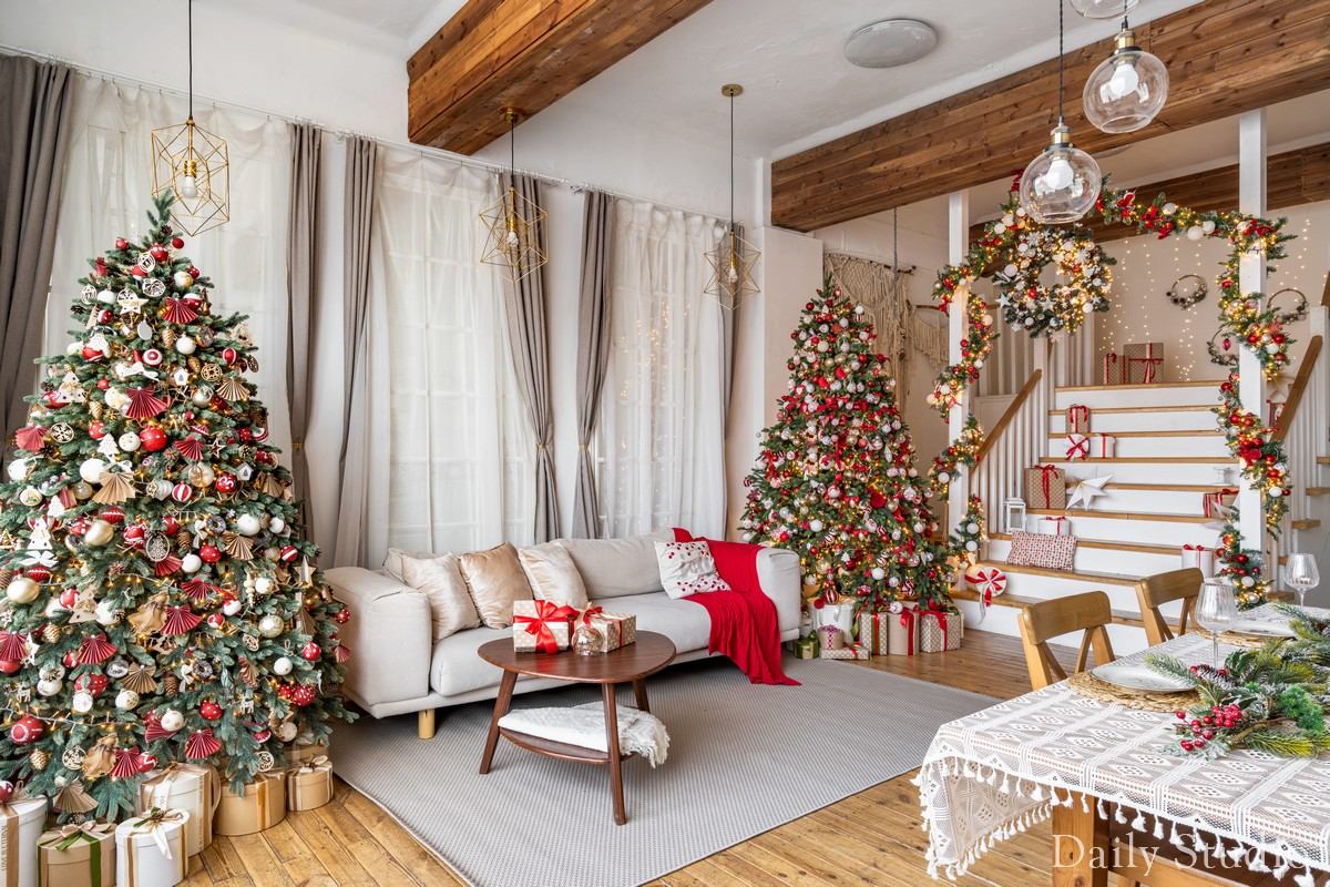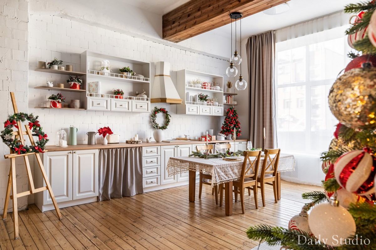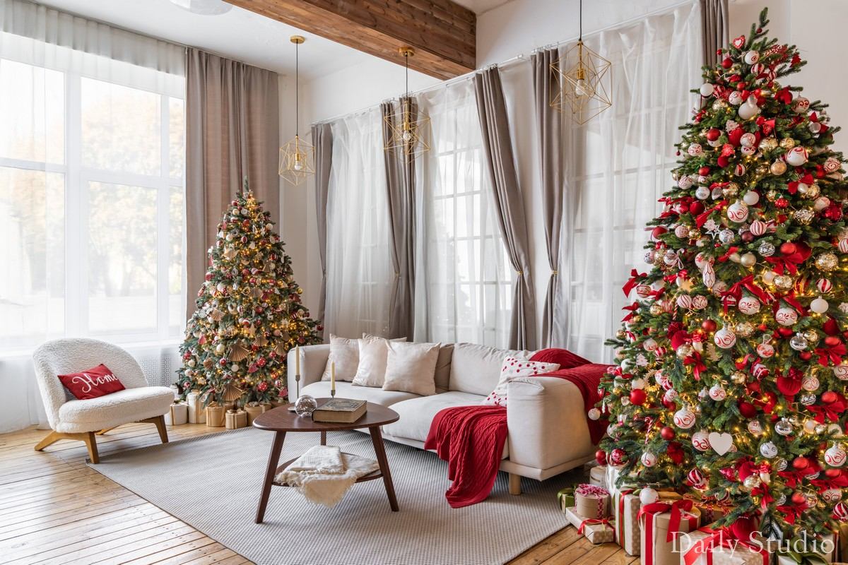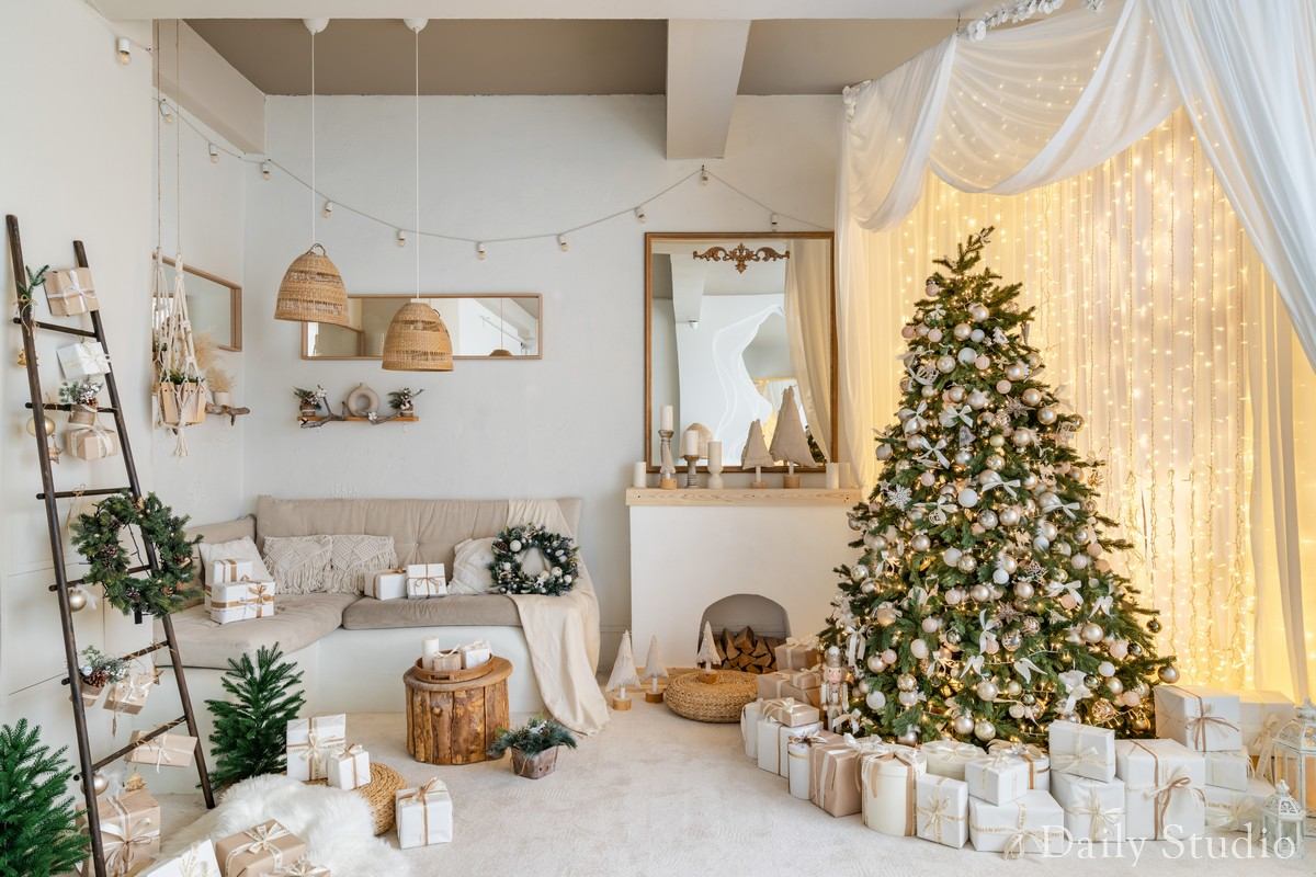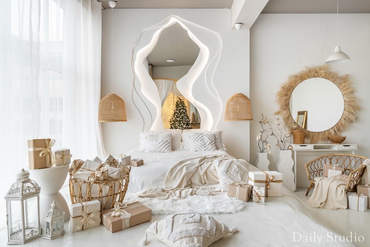 Shanti — настоящее воплощение уюта и гармонии. Он разделен на две зоны, каждая из которых наполнена уютом и атмосферой праздника. Первая зона — двуспальная кровать на подиуме с необычной формой зеркалом и туалетным столиком с новогодними декорациями, вторая — пышная елка с бежевым угловым диваном и по-новогоднему украшенным камином.