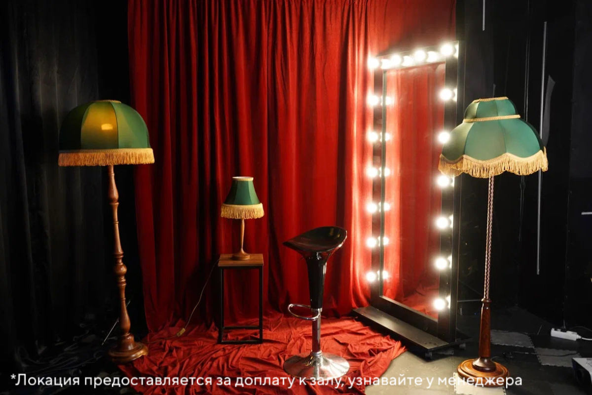Серая циклорама, импульсный свет: четыре источника Profoto D1 500 Air, постоянный свет: два светодиодных источника Godox LITEMONS LA150Bi, кольцевая лампа, фоновая система, естественный свет, текстурная стена, интерьерная зона с трюмо, камерная гримёрка