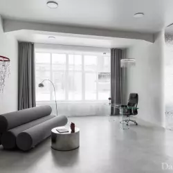 Зал площадью 50 кв.м с большим панорамным окном на солнечной стороне. Интерьер представляет собой апартаменты в современном европейском стиле.