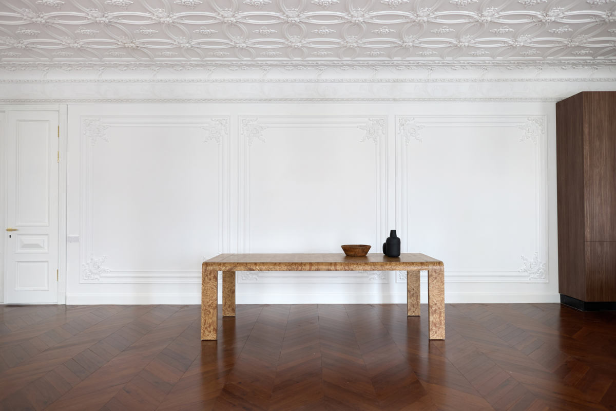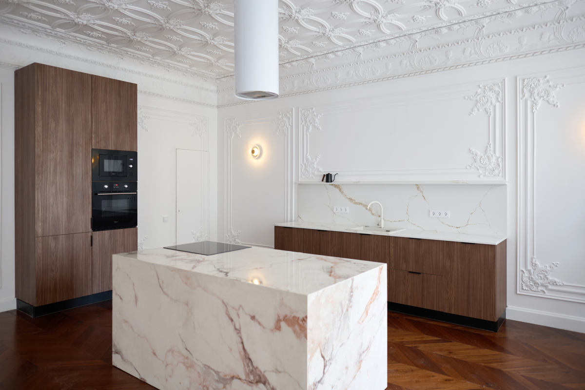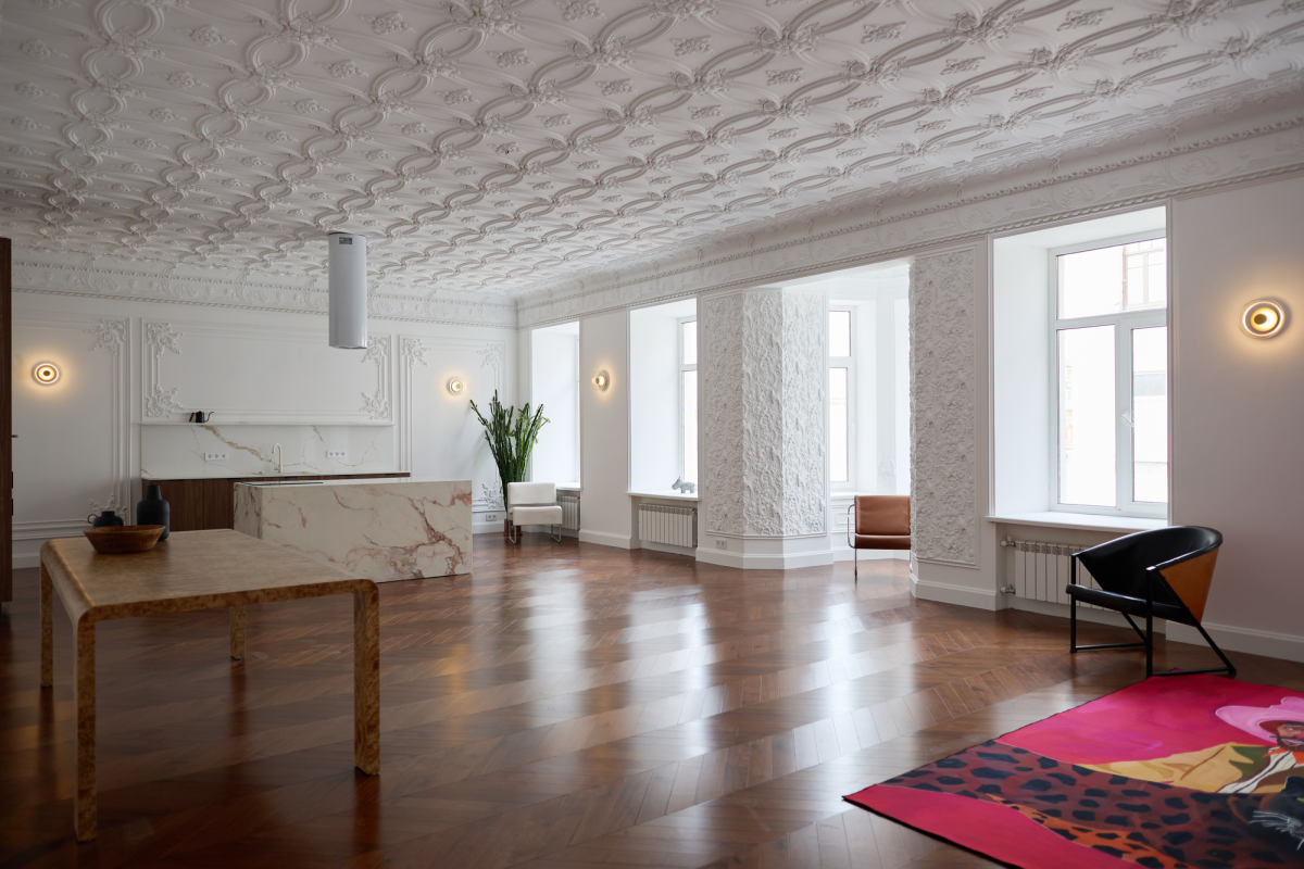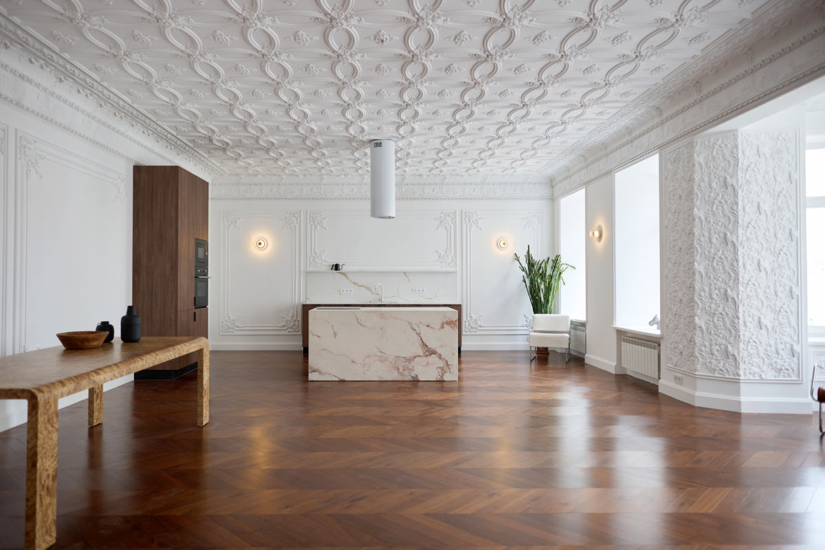 Большой интерьерный зал с роскошной лепкой и кухней.
