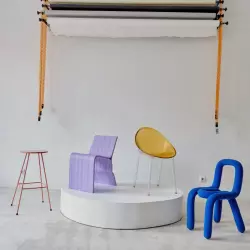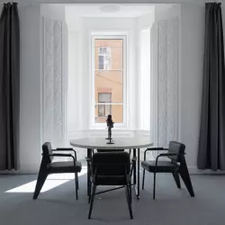 Soda - светлый минималистичный зал, с дизайнерской мебелью разных форм, рельефными стенами и бумажными фонами.