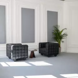 Стены в зале выполнены в специальной ткани - черной и темно-серой и обладают отличными звукоизоляционными свойствами.