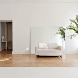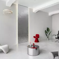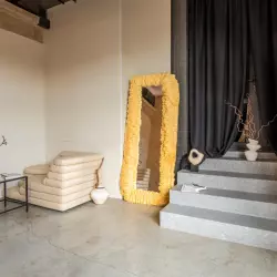 локации в зале: циклорама, диван, стеллаж, напольное зеркало, кресла, журнальный столик, фактурная стена.