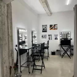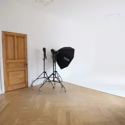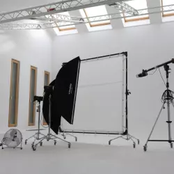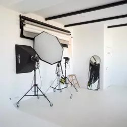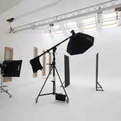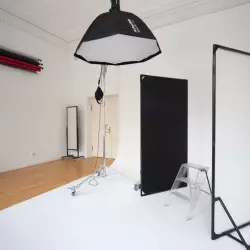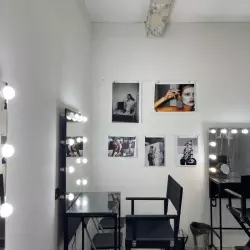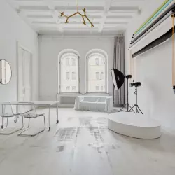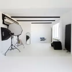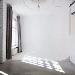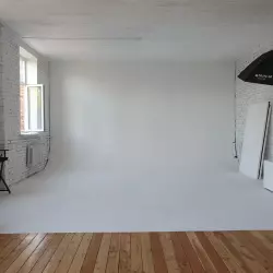 Зал площадью 45 кв.м с белой угловой циклорамой. Основная часть зала - 35 м (5.2 х 6.7) +11 кв.метров дополнительная часть, оборудованная собственным гримерным местом.