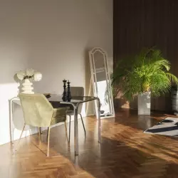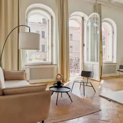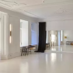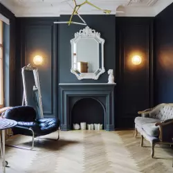 Обновленный осенью 2024 года минималистичный интерьерный зал площадью 50 кв.м. Пол - паркет, массив дуба с темной тонировкой. Стена с деревянными темными панелями. Стена с классической лаконичными гипсовыми молдингами и входной дверью. Высокие потолки. 4 окна зала выходят во двор, вид на лютеранскую церковь. Солнце в зале с утра и постепенно уходит до 11.