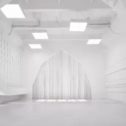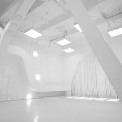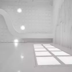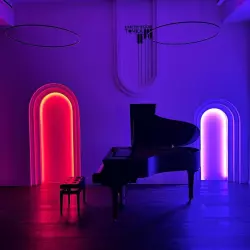 Полностью белый зал расчерченный лаконичными линиями и фактурами. Мгновенно преображается с помощью яркой неоновой подсветки.