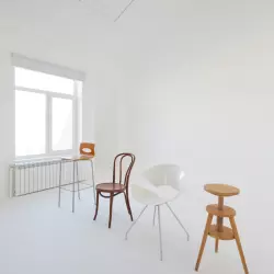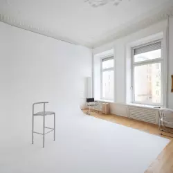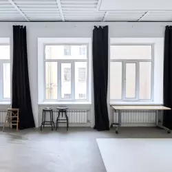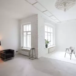 Маленький мансардный зал с 5 окнами и автоматической системой бумажных фонов. Площадь 20 кв.м (зал узкий, ширина примерно 2,5 м). Естественное освещение в течение всего светового дня. Отличный зал для съемки контента, портретов, небольшой встречи