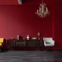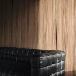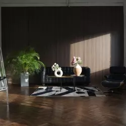 Большой интерьерный зал выполненный в стилистике интерьеров 1970х годов. Большая деревянная стена. Красивый эркер. Пол - плитка.