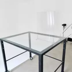 В съемочной зоне расположена белая циклорама и система монохромных бумажных фонов. Стеклянный стол для съемок снизу 1300-1500, h1300!