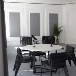 Здесь можно провести видео запись интервью, подкастов и тд, съемки в офисной стилистике, бизнес портреты. Зал практически универсальный под любые задачи.