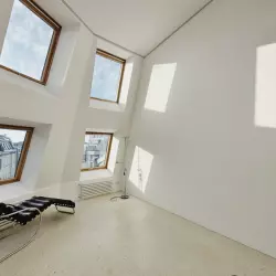 Белый зал площадью 50м2 с большим балконом (длина 6м) и вторым ярусом 15 кв.м. Площадь первого яруса - 35м2. Потолок общий 5,7 м, на втором ярусе 2,2 м. Фактурная угловая стена в бежевых оттенках. Деревянный темный дубовый пол. 2 огромных окна, выходящих на север города. Вид на набережную Невы и Петропавловскую крепость