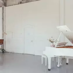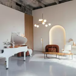 Утончённый белоснежный зал с действующим роялем Yamaha.