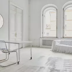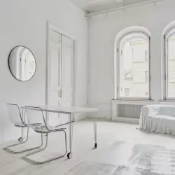 Минималистичный интерьер с лаконичной мебельюБалкон с видом на перспективу Каменноостровского проспекта.