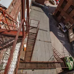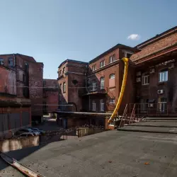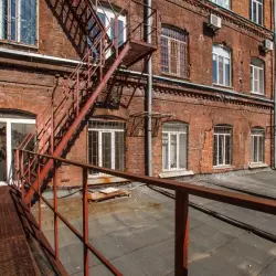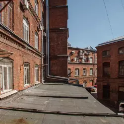 Выход на крышу возможен с 1 апреля. Крыша окружена архитектурой бывшего завода, пространство в стиле лофт.