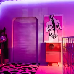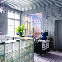 Днем рецепцию заливают солнечные лучи, отражаясь от радужной пленки и стеклокубов, оставляют красивые блики и эффекты на стенах. Вечером пастельные тона коридора и рецепции в свете неона открывают в пространстве совершенно новую геометрию. Романтика 80ых в современном прочтении и гипнотический корид