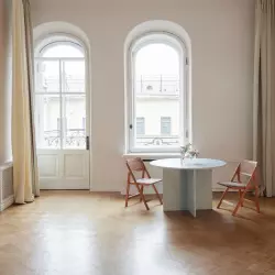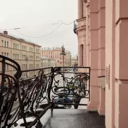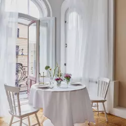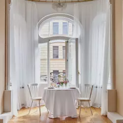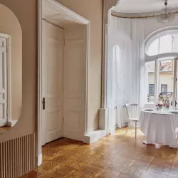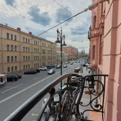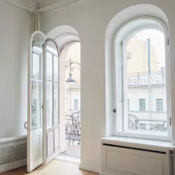 Очень светлый и минималистичный зал с лепниной, паркетом 20 века и большим балконом, выходящим на Кирочную улицу.