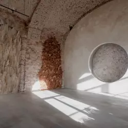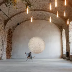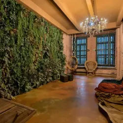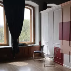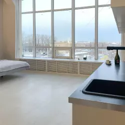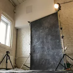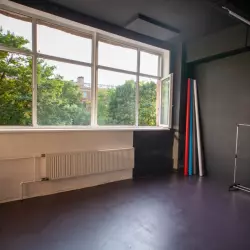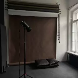 Небольшой зал с фактурной стеной и естественным светом, идеален для самых различных съёмок лаконичных портретов. Расположение панорамных окон позволяет работать при четком дневном свете с самого утра и до вечера. Доступны цветные фоны и чёрная стена, также попадающая в зону дневного света.