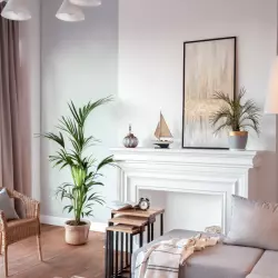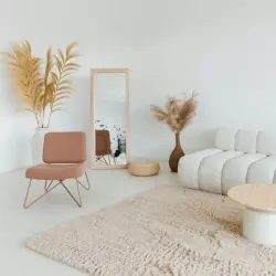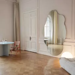 локации в зале: циклорама, диван, стеллаж, напольное зеркало, кресла, журнальный столик, фактурная стена.