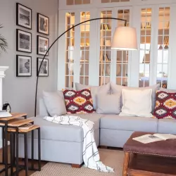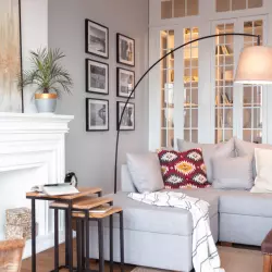 Зал с серым углом, интерьерной частью, фотонов системой и стеной с молдингами.