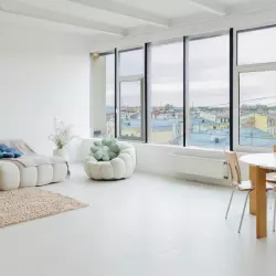 Светлый семейный минималистичный зал, диванные модули на колесах. Детский уголок с виг-вамом и пуфами-животными. 10 метровое панорамное окно во всю стену, выходящее на восток, потолок 3,3 м. Шикарный вид на храм Спаса-на-крови и панораму питерских крыш!