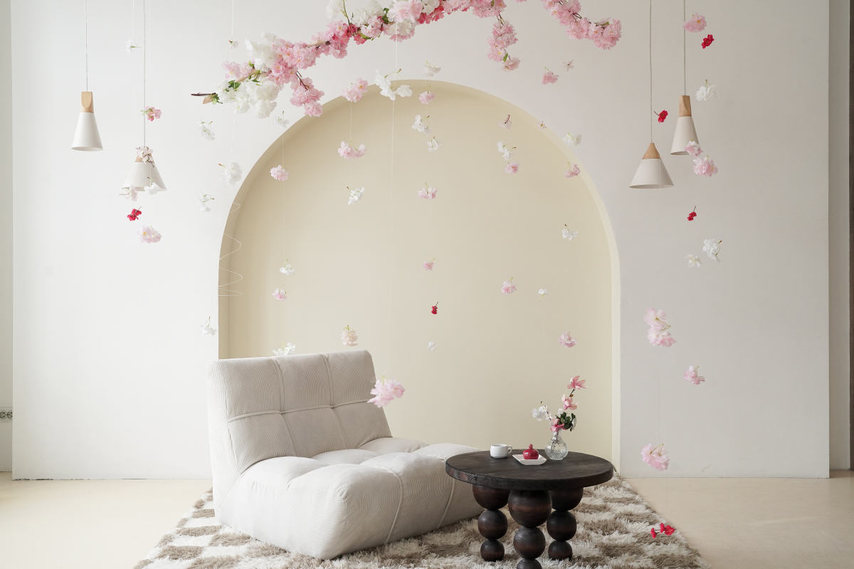 Подвесная система бумажных фонов, светлые фактурные стены, 2 декорации: сад-огород, романтический стиль