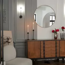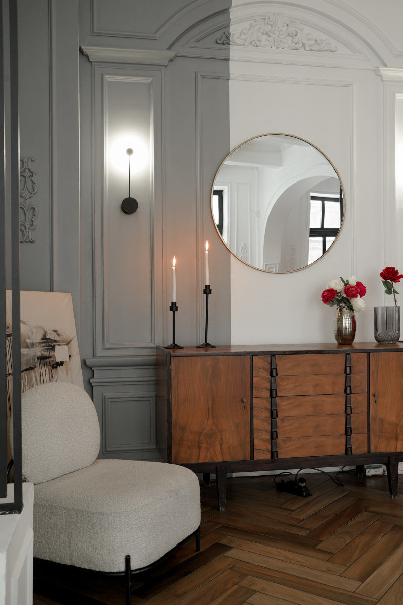 В зале находится серый диван, круглое окно