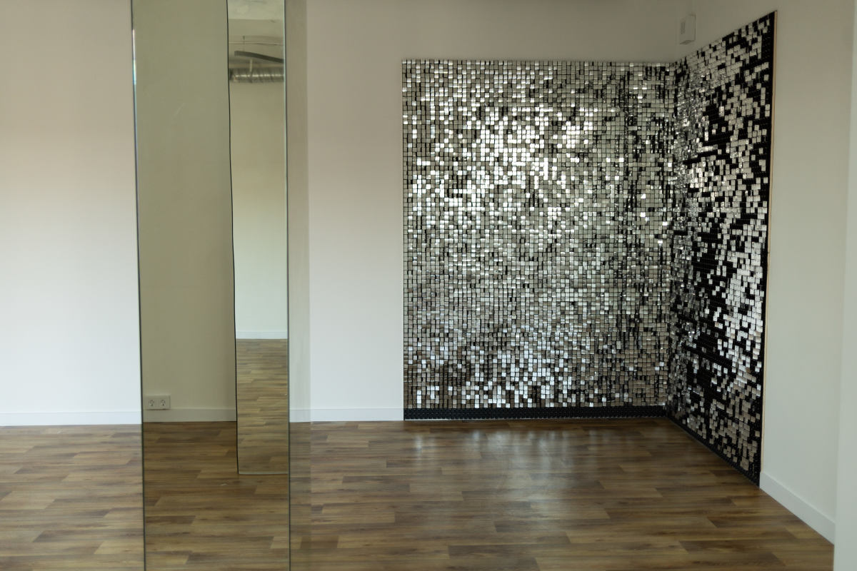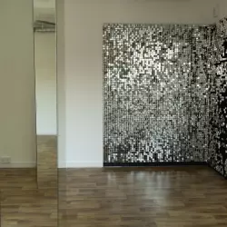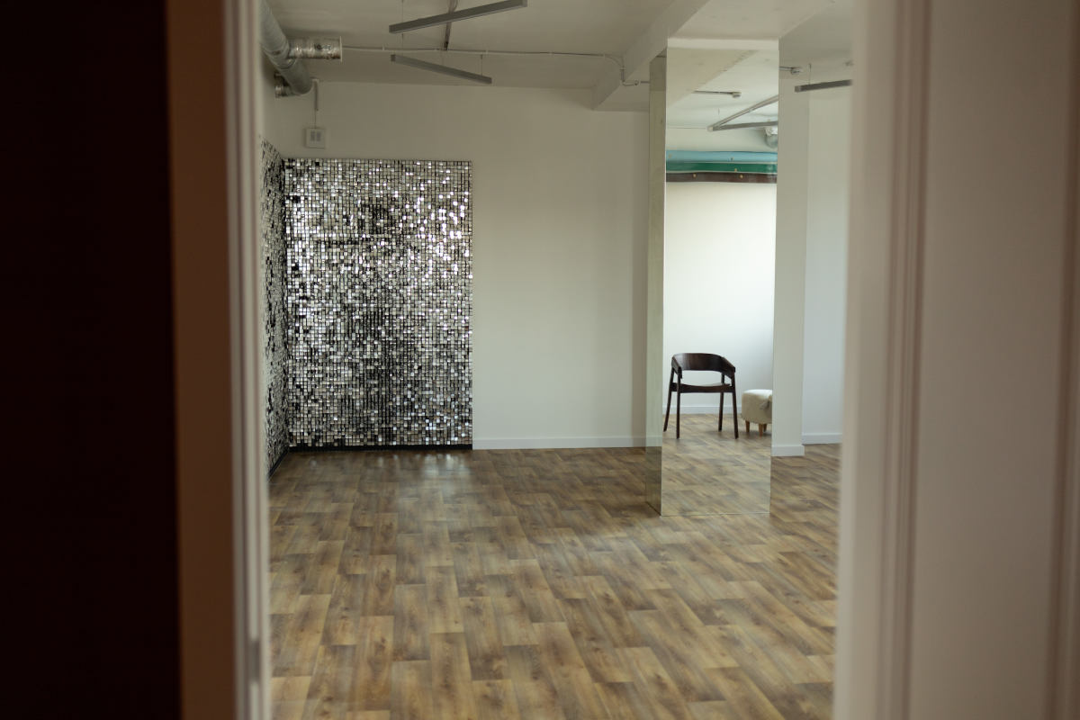 Светлое пространство с зеркальными колоннами, мерцающей фотозоной и белой стеной со сменяющимися фонами