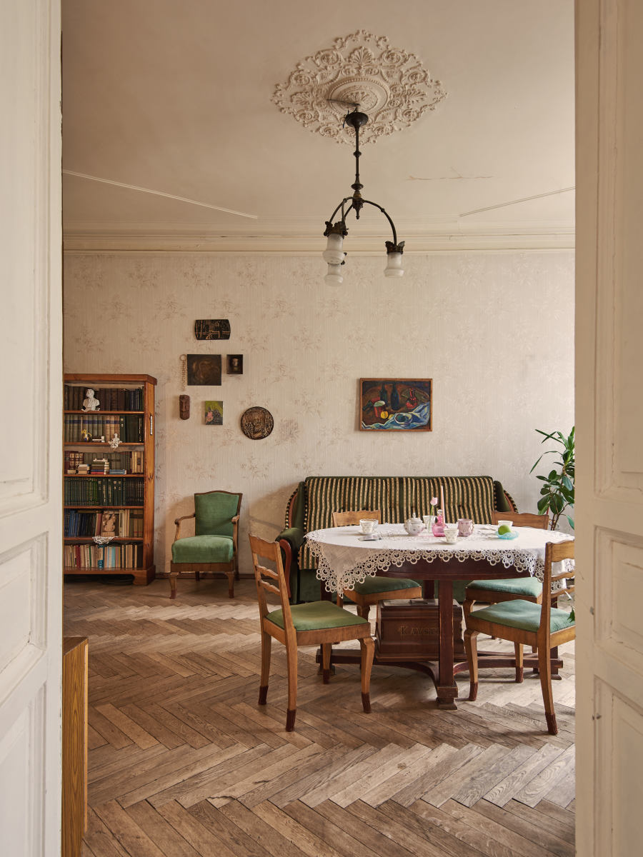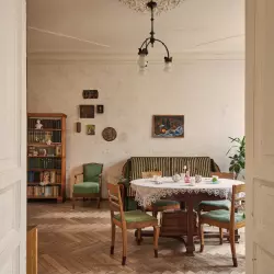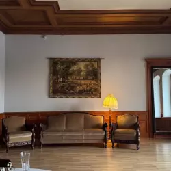 Большой интерьерный зал выполненный в стилистике интерьеров 1970х годов. Большая деревянная стена. Красивый эркер. Пол - плитка.