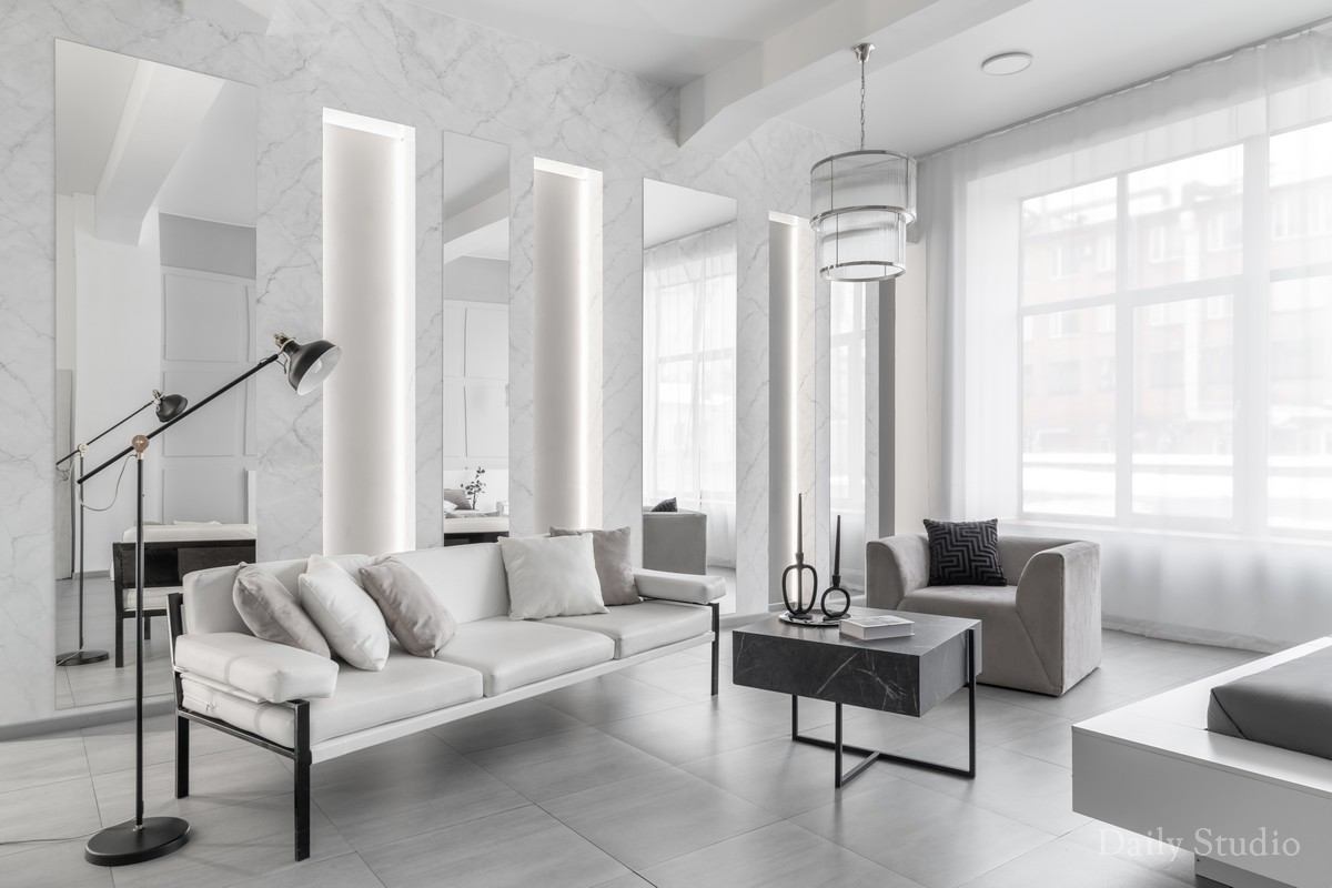 Оформленный в белых, серых и черных тонах, просторный и минималистично декорированный зал Balance станет идеальным пространством для стильных кадров.