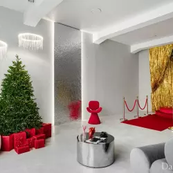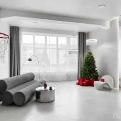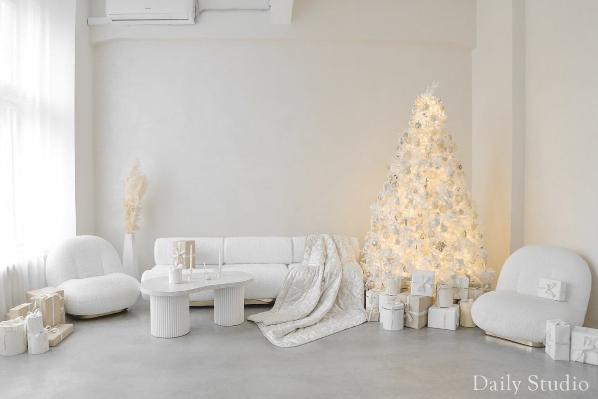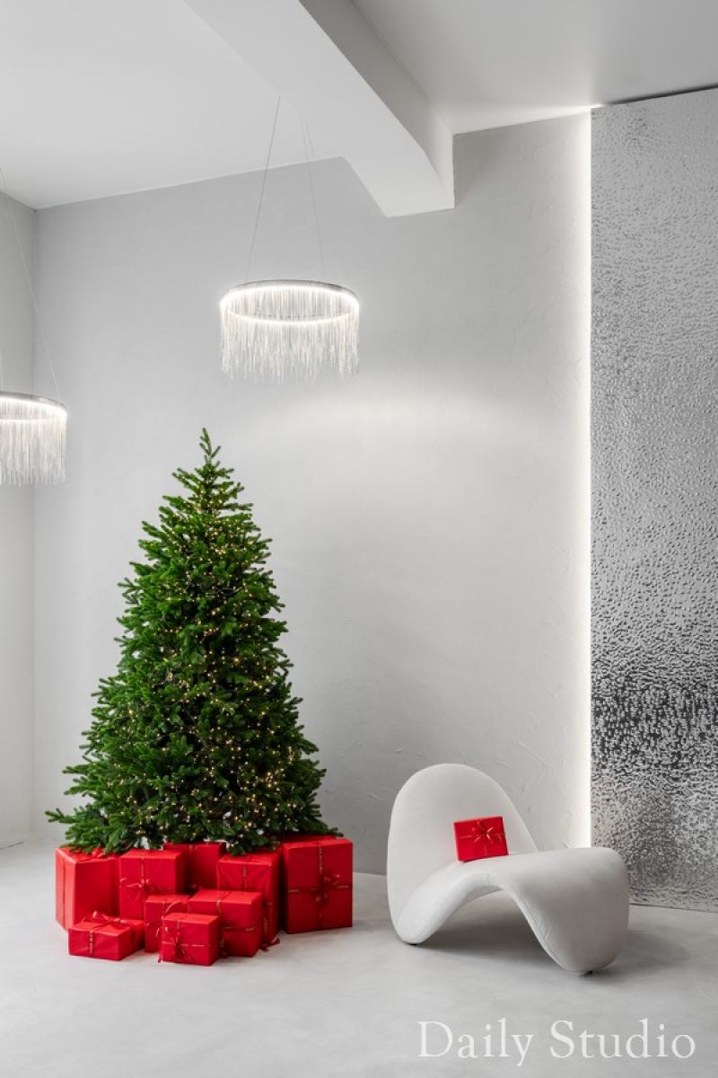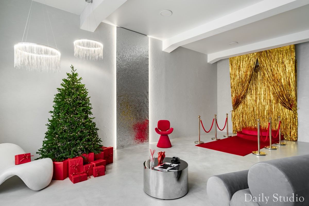 Оформленный в белых, серых и серебристых тонах, минималистично декорированный зал Balance станет идеальным пространством для стильных новогодних кадров.