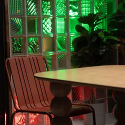 Полностью белый зал расчерченный лаконичными линиями и фактурами. Мгновенно преображается с помощью яркой неоновой подсветки.