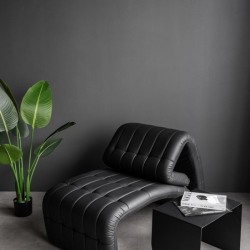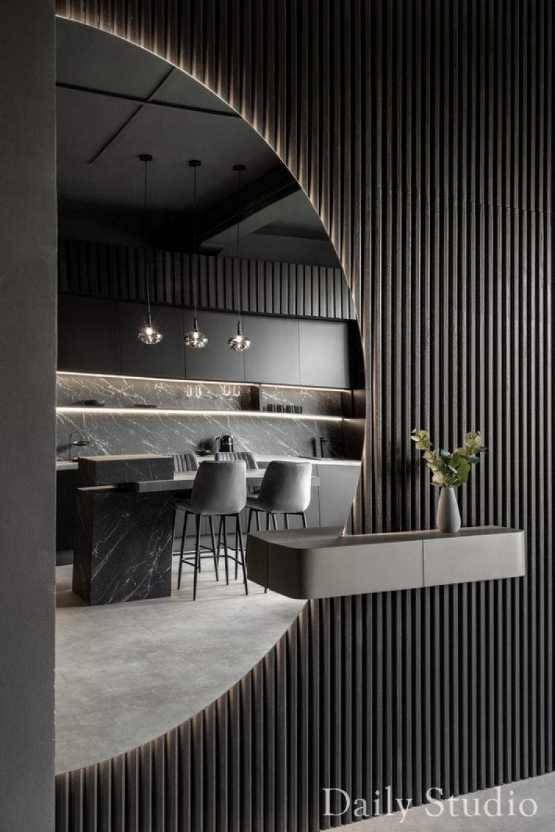 — зона с полукруглым встроенным зеркалом, реечными панелями на стене и черным кожаным креслом;