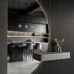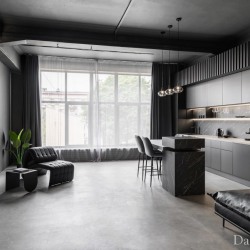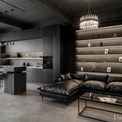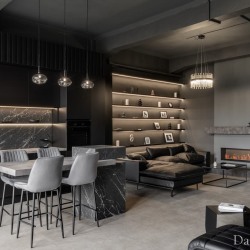 Зал выполнен в современном стиле с акцентом на монохромную гамму. Доминируют глубокие графитовые,
