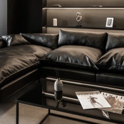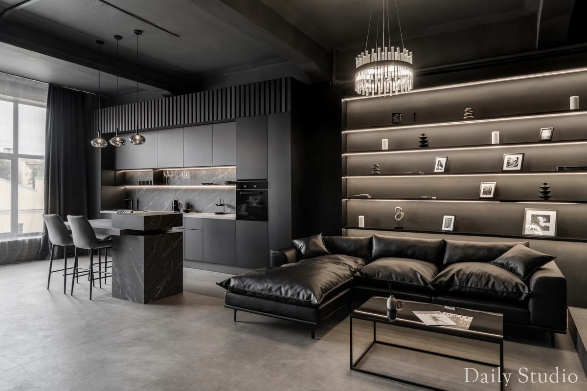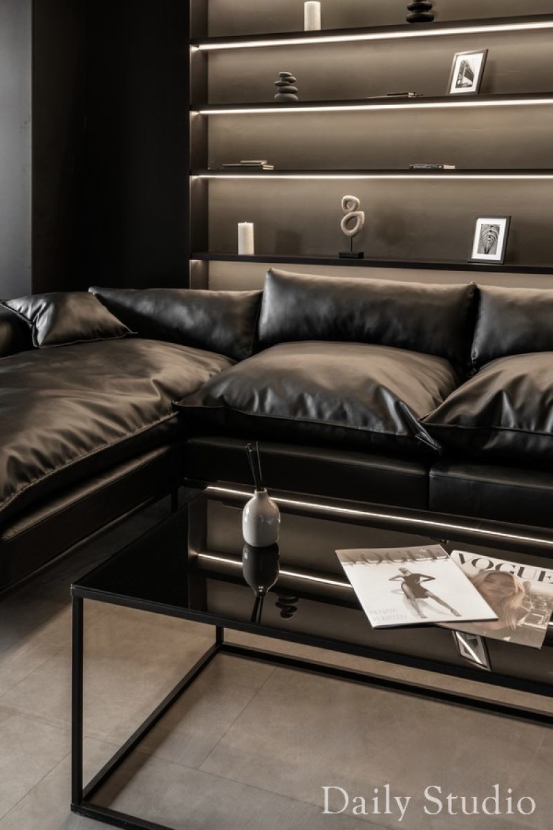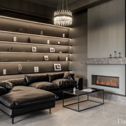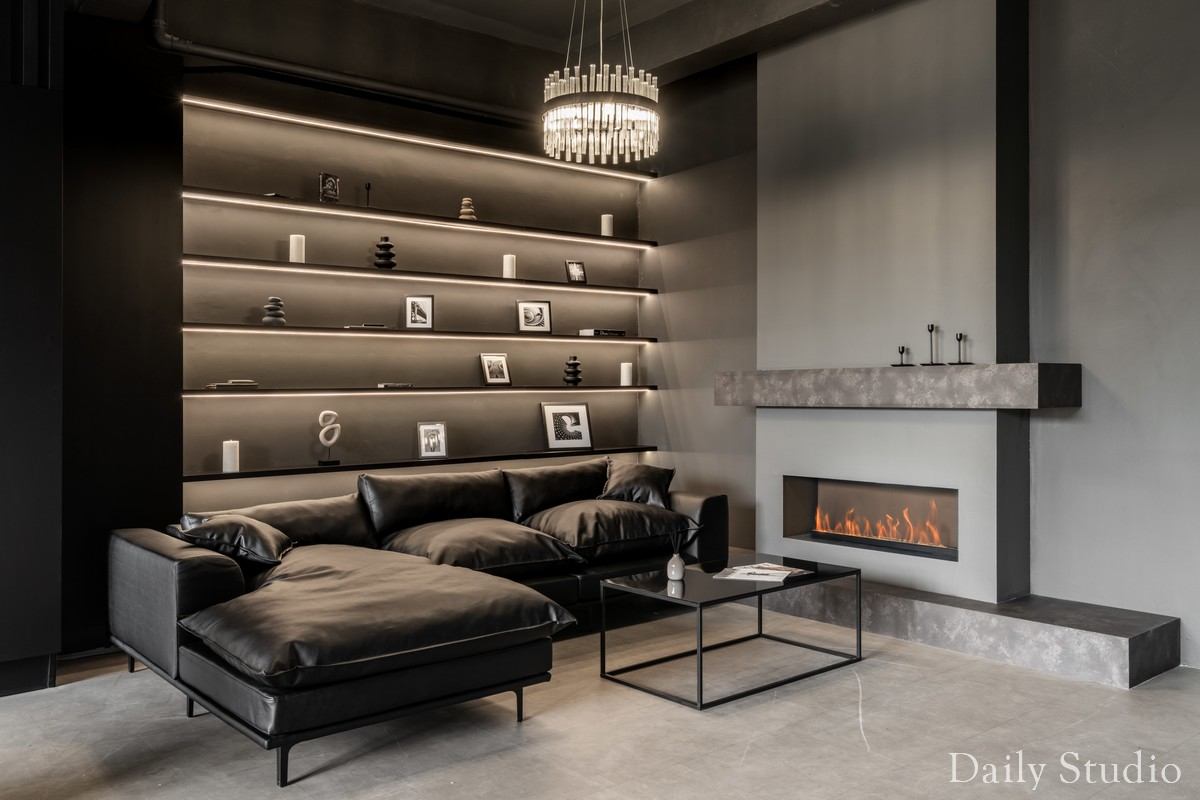 — гостиная зона со стильным черным кожаным диваном, журнальным столиком, камином и настенными полками